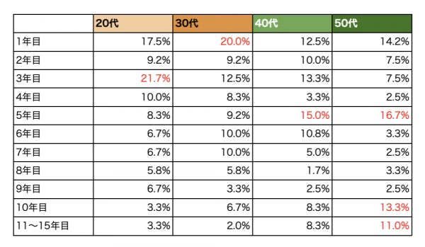 結婚1年目が16%で最多となり、次いで結婚3年目が約14%となりました。その次に結婚5年目で約12%です。