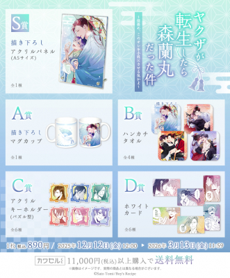 S賞は、「カワセルくじ」の為だけに新規で描き下ろしていただいた「冬の町へ出かける2人」のイラストを使用したアクリルパネル!A5サイズでイラストをお楽しみいただけます。 A賞マグカップは扇子や髪紐をモチーフにしたアイテムを通して、作品の世界観を存分にお楽しみいただけます。その他の賞も、カラーイラストやコミックスから厳選されたイラストをデザインした、どれが当たっても嬉しい豪華ラインナップです。