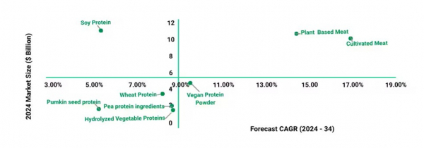 健康志向と持続可能性を重視する消費者の増加により、世界の食品需要が変化している。こうした動きにより、大豆や小麦といった既存の原料から、培養肉やカボチャ種子タンパク質といった新しい原料まで、代替タンパク質への関心が急速に高まっている。主要カテゴリーの現在規模と将来性を比較するため、グローバル マーケット モデルが市場全体を分析した。