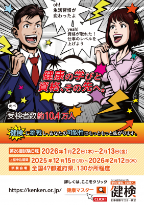 第26回日本健康マスター検定の受検申込は12月15日(月)~2月12日(木)、「合否即時発表」「期間内同一コース再受験可能」として全国47都道府県約130CBT試験会場(予定)にて開催します。試験期間は1月22日(木)~2月13日(金)、再受験を希望する場合は試験翌日9時までにマイページにアップされた合否結果を確認して申し込むと、最短試験日の翌々日より再受験が可能となります。第20回検定より新テキスト(健康日本21・第3次対応 https://kenken.or.jp/student/text)準拠に切替わり、健康マスターコースは「100年ヘルスケアバイブルI(健康マスター版)」、エキスパート健康マスターコースは「100年ヘルスケアバイブルI(健康マスター版)」「100年ヘルスケアバイブルII(エキスパート版)」2冊の学習が必要になります。