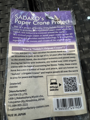 なお「原爆の子の像」モデルとなった佐々木禎子さんの鶴「サダコの鶴」は特定非営利活動法人 SADAKO LEGACY顧問の樽谷大助が平和祈念の想いを込めたピンバッチのレプリカを作成して世界の要人に贈呈を行っている。