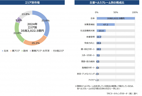 ◆2024年の世界における健康食品市場は前年比4.4%増の35兆3,022.5億円となった。エリア別の市場では北米が構成比33.6%を占めて最大となっており、以下東アジア(日本、中国、韓国、台湾)が同25.2%、欧州が同22.0%、東南アジア・太平洋(インドなど一部南アジアを含む)が同5.4%、その他エリア(南米、中東、アフリカ)が同13.8%と続いている。