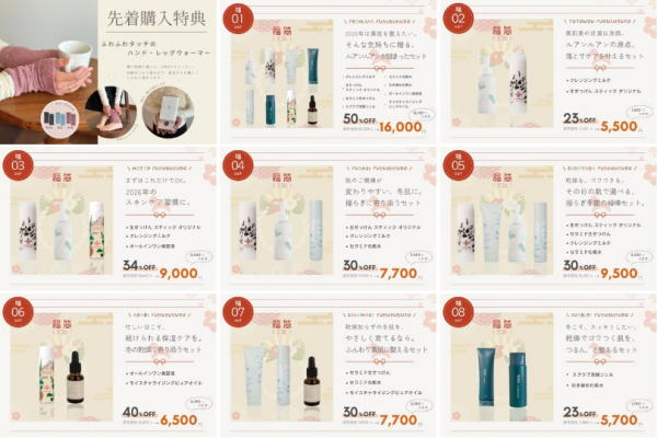 冬の肌にそっと寄り添うセットや、一年の締めくくりに選びたくなるご褒美セットまで。 想いを込めて8つの特別な福袋をご用意しました。