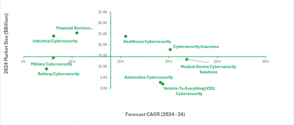 ● 軍事サイバーセキュリティと鉄道サイバーセキュリティは、中程度の市場規模で安定成長が続く専門的なインフラ領域である。