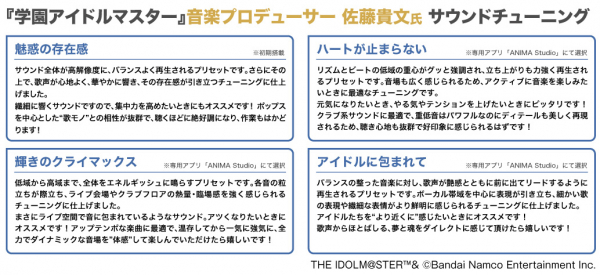 本コラボレーションモデルは、作品をイメージしたモチーフを左右ハウジングプレートに配置。音声ガイダンスは「月村手毬(CV.小鹿なお)」新規録り下ろしボイスを搭載。電源オンやオフ、ペアリング時やタップ音等計20ワードのボイスを楽しめます。音質は『学園アイドルマスター』音楽プロデューサー「佐藤貴文氏」※3によるサウンドチューニング。初期搭載プリセットは「魅惑の存在感」。専用アプリ「ANIMA Studio」での選択(無料)にて「ハートが止まらない」「輝きのクライマックス」「アイドルに包まれて」計3種のプリセットを楽しむ事が可能です。パッケージは「月村 手毬」描き下ろしイラストデザインとなっております。
