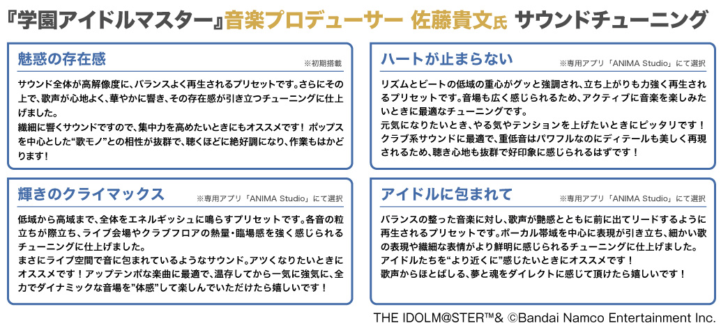【サウンドチューニング】 ※プリセット使用には専用アプリ「ANIMA Studio(※iOS/Android)」が必要です。