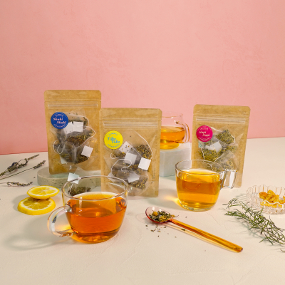 私たちのコンセプトである「一日の生活リズムを整え、心と身体が元気になるハーブティー」をBunny’s Herbさんに相談し、「朝・昼・夜」という時間の流れに寄り添う3種類のオーガニックハーブティーが誕生しました。茶葉だけでなく、パッケージやティーバッグの素材も、できるだけ環境に配慮したものにしたい、という要望にも応えていただき、数か月の開発期間を経て完成しました。また、各フレーバーの名称は、Bunny’s Herbさんの商品名のつけ方を参考に、オノマトペを使ってコンセプトや味、効能が連想できるものにしました。