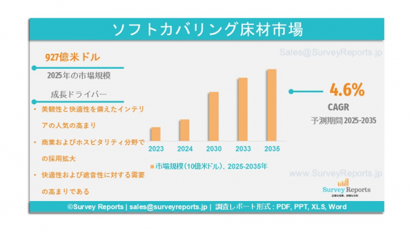 Survey Reports LLCは、2025年12月に調査レポート「ソフトカバリング床材市場:製品別(ブロードルーム、カーペットタイル)、流通チャネル別(施工業者、専門店、ホームセンター、その他の流通チャネル)、エンドユーザー別(住宅、商業)- グローバル市場分析、トレンド、機会および予測(2025年~2035年)」を発行したと発表した。本レポートはソフトカバリング床材市場の将来予測評価を提供するものであり、成長要因、市場機会、課題、脅威など、同市場における複数の主要な市場ダイナミクスを明らかにするものである。
