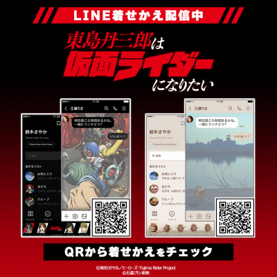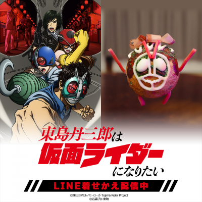 アニメ『東島丹三郎は仮面ライダーになりたい』初となるLINE着せかえが2点同時にインクルーズより配信開始! 記念すべき第1弾はキービジュアルを使用し黒を基調としたクールなデザイン。同時に配信される第2弾はEDで登場した「たこ焼きデザイン」です。お気に入りのデザインでLINEを着せかえてお楽しみください!