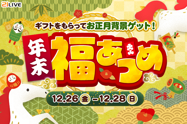 株式会社エムアンドティーティー(本社:沖縄県北谷町、代表取締役:井藤 三知子)が運営するエンターテイメント・ライブ配信アプリ【21LIVE(ニーイチライブ)】URL: https://21.live では、12月26日(金)より『ギフトをもらってお正月背景をゲット!年末福集め』を開催します。