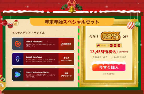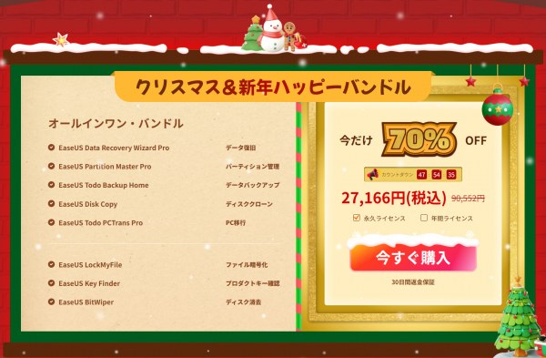 EaseUS Software Co., Ltd.は、2025年12月17日(水)より、クリスマス・年末年始セールを開催いたします。本キャンペーンでは、クーポンコード発行のほか、オールインワンバンドルも超お得なスペシャル価格にてご入手いただけます。