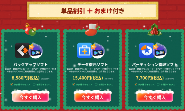バックアップソフト、データ復元ソフト、パーティション管理ソフトをセットでお求めいただくと、動画ダウンローダーとPCデータ移行ソフトを無料でお手に入れるので、おすすめします。