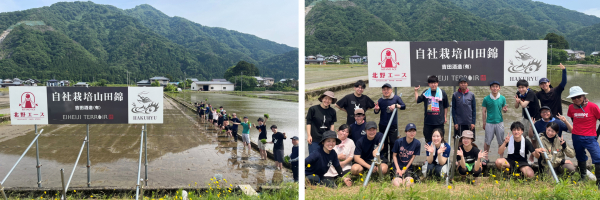 2025年5月、全国から集まった12名の北野エーススタッフが福井県永平寺町へ。プロジェクト用に大きなロゴマークの入った看板を設置いただいている吉田酒造さまの田んぼにて、酒米の苗を手植えしました。ここから、約7カ月の酒物語プロジェクトがスタート。参加メンバーのほとんどが初めての田植え体験ということもあり、蔵人の皆様からレクチャーを受けながら作業に取り組みました。指先に収まるサイズの苗が、数か月後には日本酒として店舗に並ぶことを考え、想いがこもります。