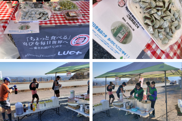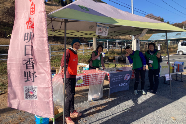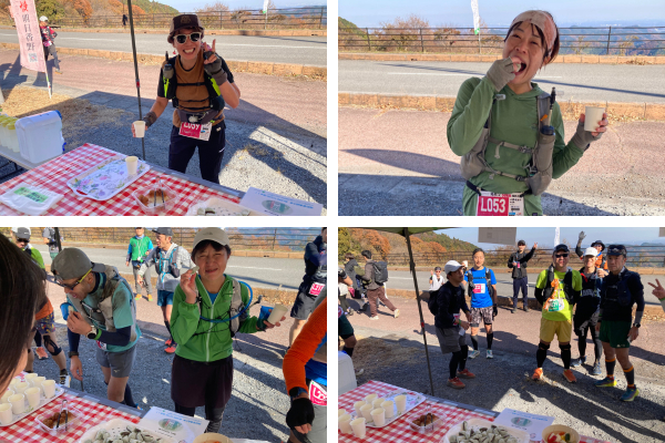大会当日の朝は冷え込み、スタート時の気温は3.2度を記録しましたが、絶好の晴天に恵まれ、走りやすいコンディションになりました。ランナーは急傾斜に大粒の汗を流しながら、足を止めることなく進み続けました。明日香野は秩父高原牧場ASにて、「増量よもぎあんこ餅」「芋きぶん」をお渡ししました。