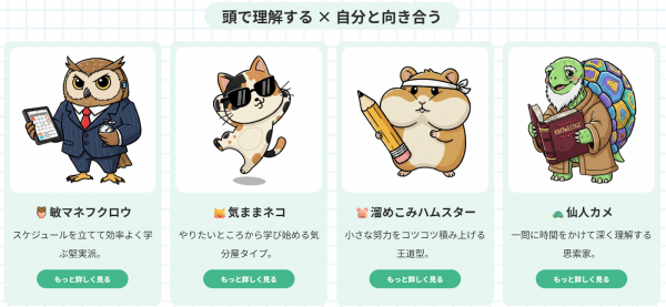 「学習タイプ診断」では、回答内容に応じて学習スタイルを16の動物キャラクターに分類。それぞれの動物には、学習の強み・つまずきやすい点・おすすめのアプローチが設定されており、自分自身を楽しく、客観的に理解できる設計になっています。