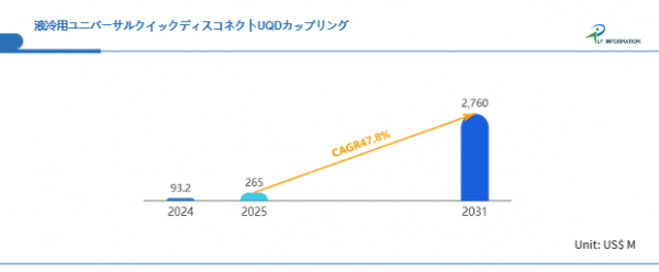 LP Informationが発表した「世界液冷用ユニバーサルクイックディスコネクトUQDカップリング市場の成長予測2025~2031」(https://www.lpinformation.jp/reports/565309/universal-quick-disconnect--uqd--coupling-for-liquid-cooling)によれば、当該市場は2025年から2031年のCAGR(年平均成長率)47.8%という驚異的な伸びを示し、2031年には27.6億米ドル規模に達すると予測されている。これは、データセンター産業の爆発的成長、HPCの演算需要、AIサーバー群の熱管理要求、さらにEV市場の液冷BMSの普及が複合的に後押ししている結果である。とりわけ、デジタルインフラのグリーン化が求められる現代において、UQDカップリングは冷却効率だけでなくエネルギー効率・カーボンニュートラル戦略の重要部品としても注目されている。