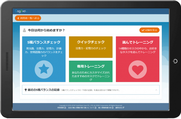 ※脳体力トレーナー「CogEvoパーソナル」は、認知症の診断機器(医療機器)ではありません。認知機能の特性に気付いていただくツール、経時変化を確認するツールとしてご使用ください