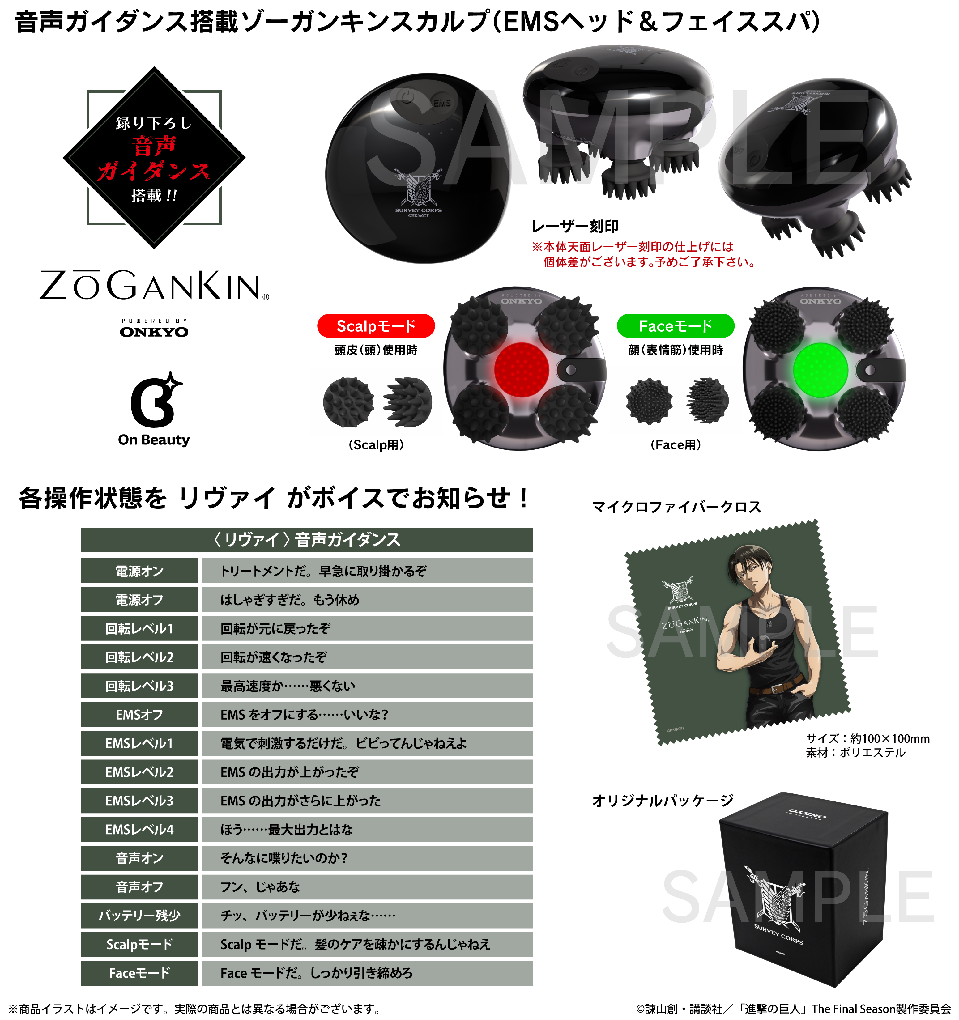 本コラボレーションモデルは、本体天面に調査兵団の紋章「自由の翼」と「Survey Corps」を配置し、「リヴァイ」による新規録り下ろしボイスを搭載。電源オンやオフ、Scalpモード、Faceモード、回転レベル、EMS等、各操作に応じてガイドしてくれるオリジナルボイス計15ワードを楽しみながら頭皮や表情筋のケアが可能です。尚、描き下ろしイラストマイクロファイバークロスを付属します。
