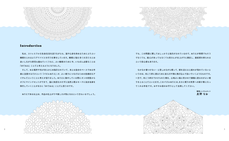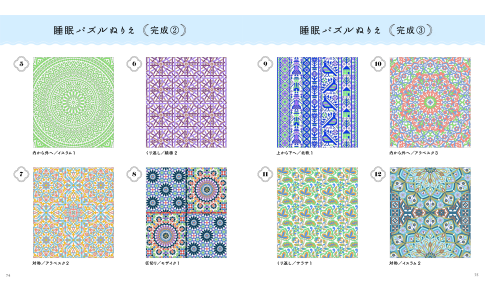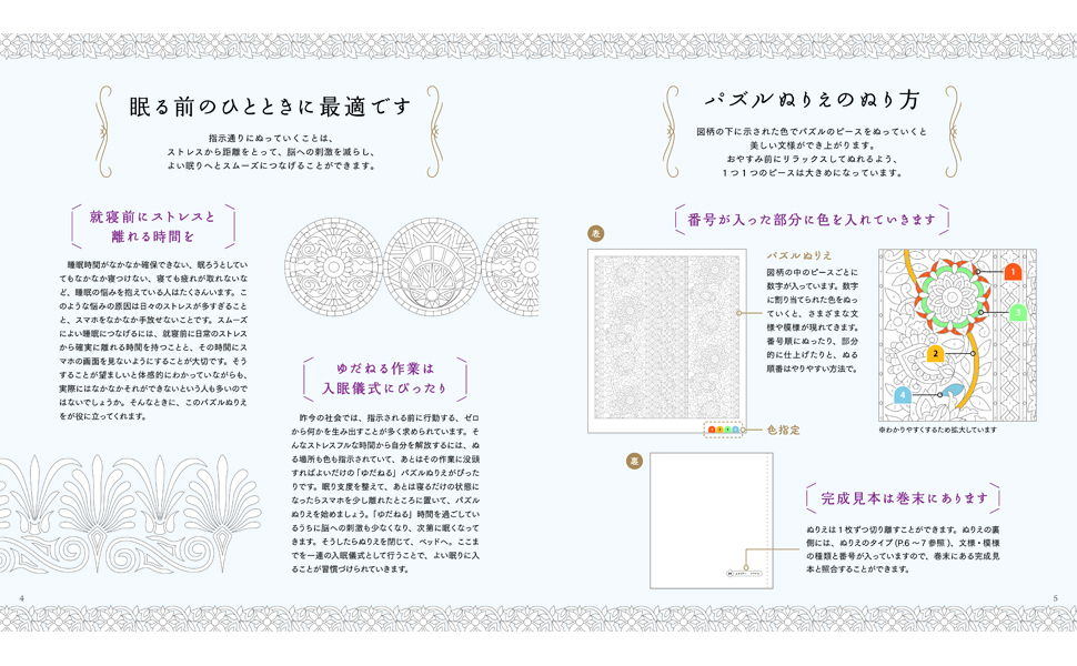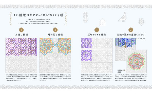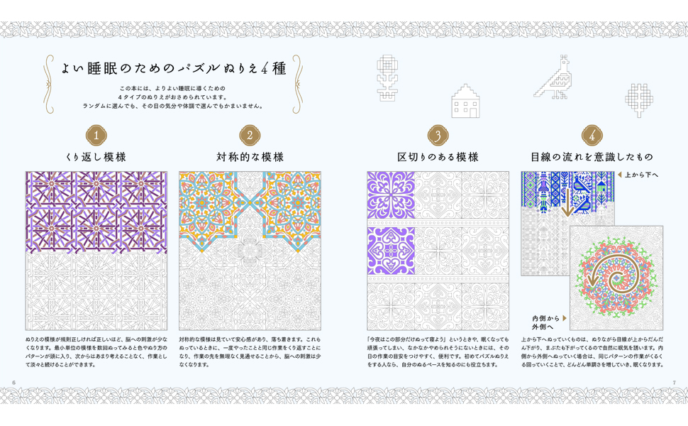本作は、指示通り塗り続けるだけで美しい文様が浮き上がる『文様パズルぬりえ』を、入眠儀式用にカスタムしたもの。