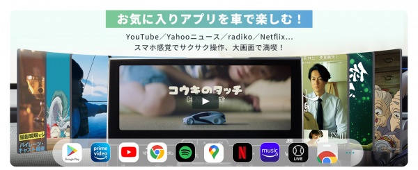 YouTube、Netflix、Amazon Music、Google マップ、Yahoo!カーナビ、SNS など、Google Play 対応アプリを自由にダウンロード可能。