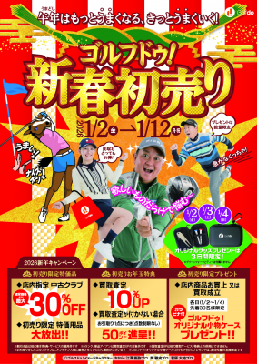 株式会社ゴルフ・ドゥ(本社:さいたま市 代表取締役社長:佐久間功)は、「ゴルフドゥ!新春初売り」を2026年1月2日(金)~12日(月・祝)に、関東1都5県、兵庫県、九州4県にある「ゴルフドゥ!」24店舗において開催いたします。