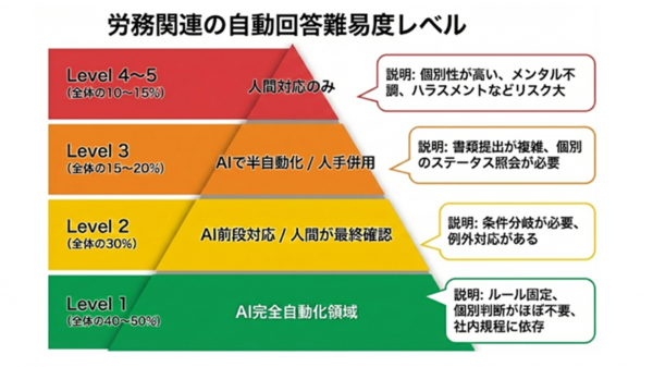 1.労務に関する問い合わせを 自動回答難易度レベル1~5に分類し、AIが対応すべき範囲(レベル1~3)を明確化しました。