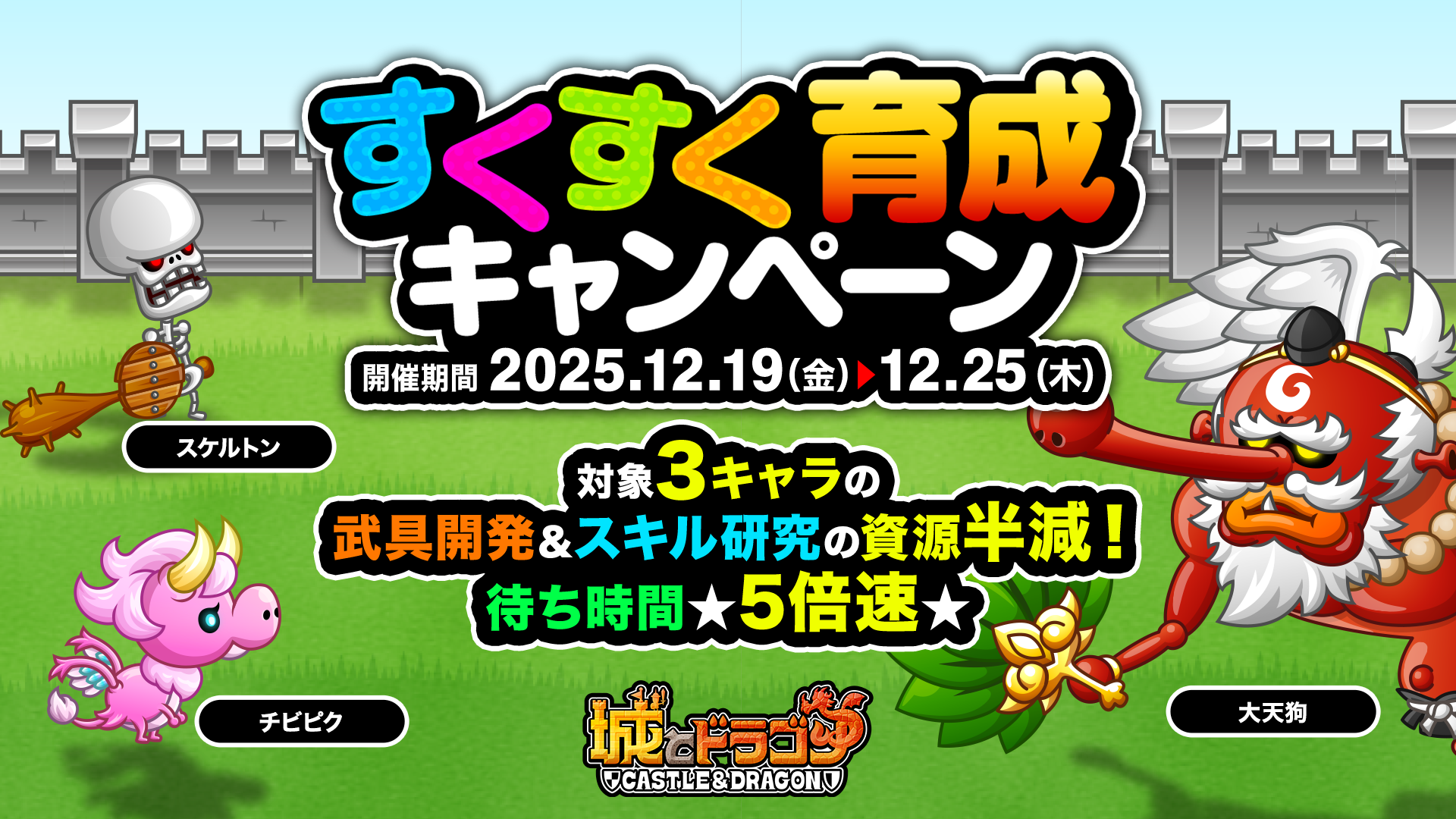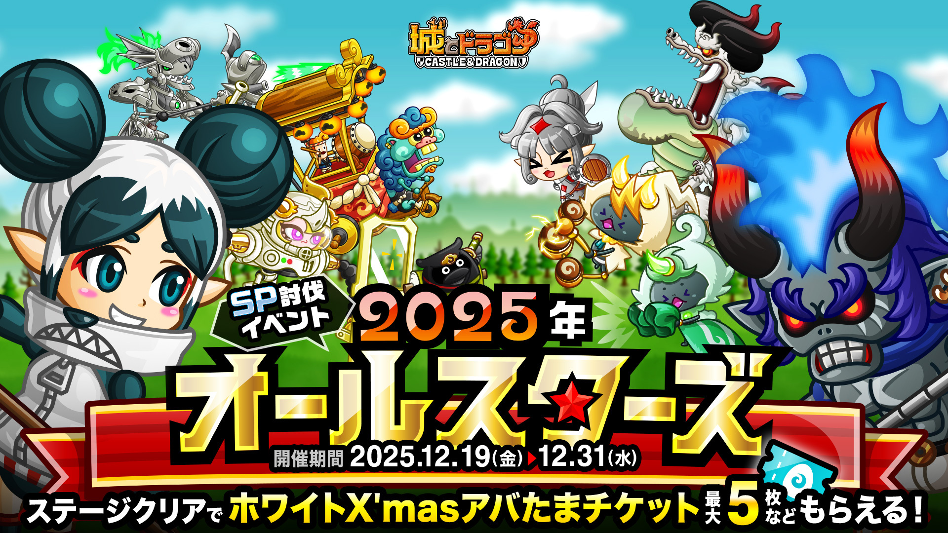 12月19日(金)メンテナンス後より、2025年の新キャラ達が登場するSP討伐イベント「2025年オールスターズ」を開催。ステージをクリアすると「ホワイトX’masアバたまチケット」最大5枚などを獲得することができます。また、当日のメンテナンス後からはスケルトンのウラワザとチビピクのアビリティを実装!さらに大天狗のLv40解放も実装いたします!それに関連し、すくすく育成キャンペーンやトロPチャージ増量キャンペーン、キャラタマゴのCP半額特別販売も実施します。年末年始も『城とドラゴン』をお楽しみください!