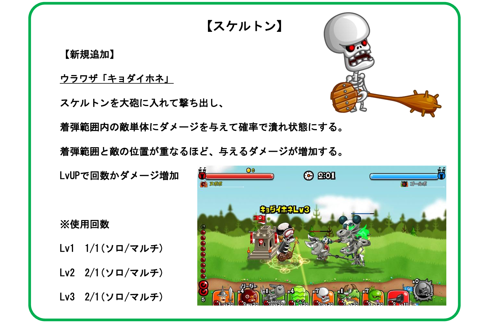 12月19日(金)メンテナンス後より、スケルトンのウラワザ「キョダイホネ」が新たに実装されます。バトルで使用すると、スケルトンを大砲に入れて発射!着地範囲の敵単体にダメージを与えます。ぜひURAWAZA交換で獲得して使ってみましょう。
