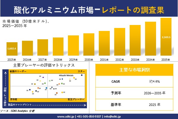 SDKI Analytics(本社:東京都渋谷区)は、このたび、2025年12月17に「酸化アルミニウム市場調査レポート:2026-2035年の市場規模、シェア、傾向の予測」を発表しました。酸化アルミニウムに関する市場調査レポートには、統計的および分析的アプローチを使用した予測評価が含まれています。この調査レポートでは、一次および二次調査方法を使用して分析された主要な業界洞察を通じて将来の傾向を理解できるようにすることで、主要な市場動向を読者に説明しています。