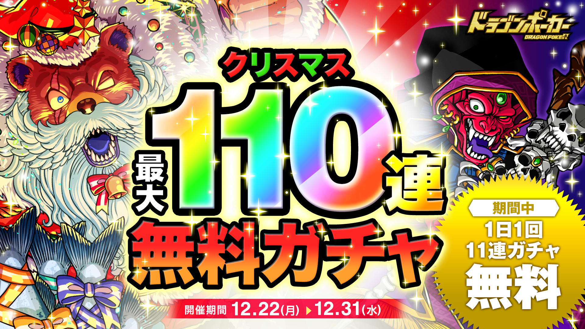 期間中、1日1回無料で11連が引ける「クリスマス最大110連無料ガチャ」を開催いたします。今回、12月の期間限定で開催中のサービスダンジョン「クリスマスタウン」で捕獲可能なカードが50%の確率で出現致します。『ドラゴンポーカー』のクリスマスを存分にお楽しみください!