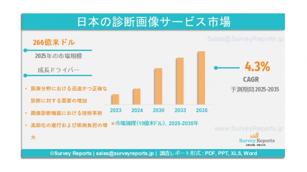 Survey Reports LLCは、2025年12月に調査レポート「日本の診断画像サービス市場:モダリティ別(MRI、コンピュータ断層撮影[CT]、超音波、X線、核医学イメージング、透視、マンモグラフィ)、用途別(循環器、腫瘍、神経、整形外科、消化器、婦人科、その他)、エンドユーザー別(病院、診断センター、その他)―市場分析、トレンド、機会および予測(2025年~2035年)」を発行したと発表した。本レポートは、日本の診断画像サービス市場に関する予測評価を提供するものであり、成長要因、市場機会、課題、脅威など、同市場における複数の主要な市場ダイナミクスを明らかにしている。