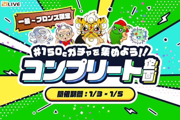 株式会社エムアンドティーティー(本社:沖縄県北谷町、代表取締役:井藤 三知子)が運営するエンターテイメント・ライブ配信アプリ【21LIVE(ニーイチライブ)】URL: https://21.live では、 1月3日(土)より『150Cガチャを集めよう!!コンプリート企画』を開催いたします。