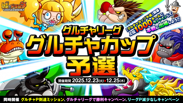 12月23日(火)6:00より『城とドラゴン』ゲーム内の「リーグ」にて、グループチャットのメンバーと協力して"グルチャP"を競う「グルチャリーグ」が開催!ランキングに応じ、報酬としてドラゴンメダルが手に入ります。また今回のリーグは「グルチャカップ予選」も兼ねており、ランキング上位1,000チームが2026年1月10日(土)より開催される本戦へのエントリー資格を得られます。メンバーと協力し、本選出場を目指しましょう!