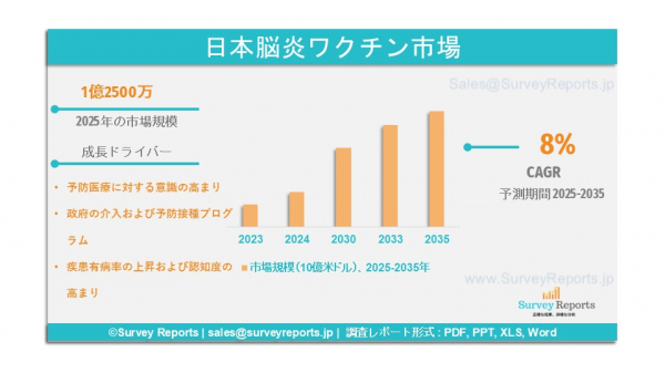 Survey Reports LLCは、2025年12月に調査レポート「日本脳炎ワクチン市場:タイプ別(Vero細胞由来ワクチン、生ワクチン、生組換え(キメラ)ワクチン)、投与回数別(単回投与ワクチン、複数回投与ワクチン)、年齢層別(小児、成人)、流通チャネル別(病院・小売薬局、政府供給機関、その他)―市場分析、動向、機会および予測、2025年~2035年」を発行したと発表した。本レポートは日本脳炎ワクチン市場の予測評価を提供するものであり、成長要因、市場機会、課題、脅威など、同市場における複数の主要な市場ダイナミクスを明らかにしている。