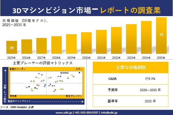 SDKI Analytics(本社:東京都渋谷区)は、このたび、2025年12月18に「3Dマシンビジョン市場調査レポート:2026-2035年の市場規模、シェア、傾向の予測」を発表しました。3Dマシンビジョンに関する市場調査レポートには、統計的および分析的アプローチを使用した予測評価が含まれています。この調査レポートでは、一次および二次調査方法を使用して分析された主要な業界洞察を通じて将来の傾向を理解できるようにすることで、主要な市場動向を読者に説明しています。