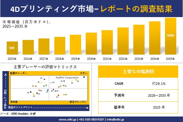 SDKI Analytics(本社:東京都渋谷区)は、このたび、2025年12月18に「4Dプリンティング市場調査レポート:2026-2035年の市場規模、シェア、傾向の予測」を発表しました。4Dプリンティングに関する市場調査レポートには、統計的および分析的アプローチを使用した予測評価が含まれています。この調査レポートでは、一次および二次調査方法を使用して分析された主要な業界洞察を通じて将来の傾向を理解できるようにすることで、主要な市場動向を読者に説明しています。