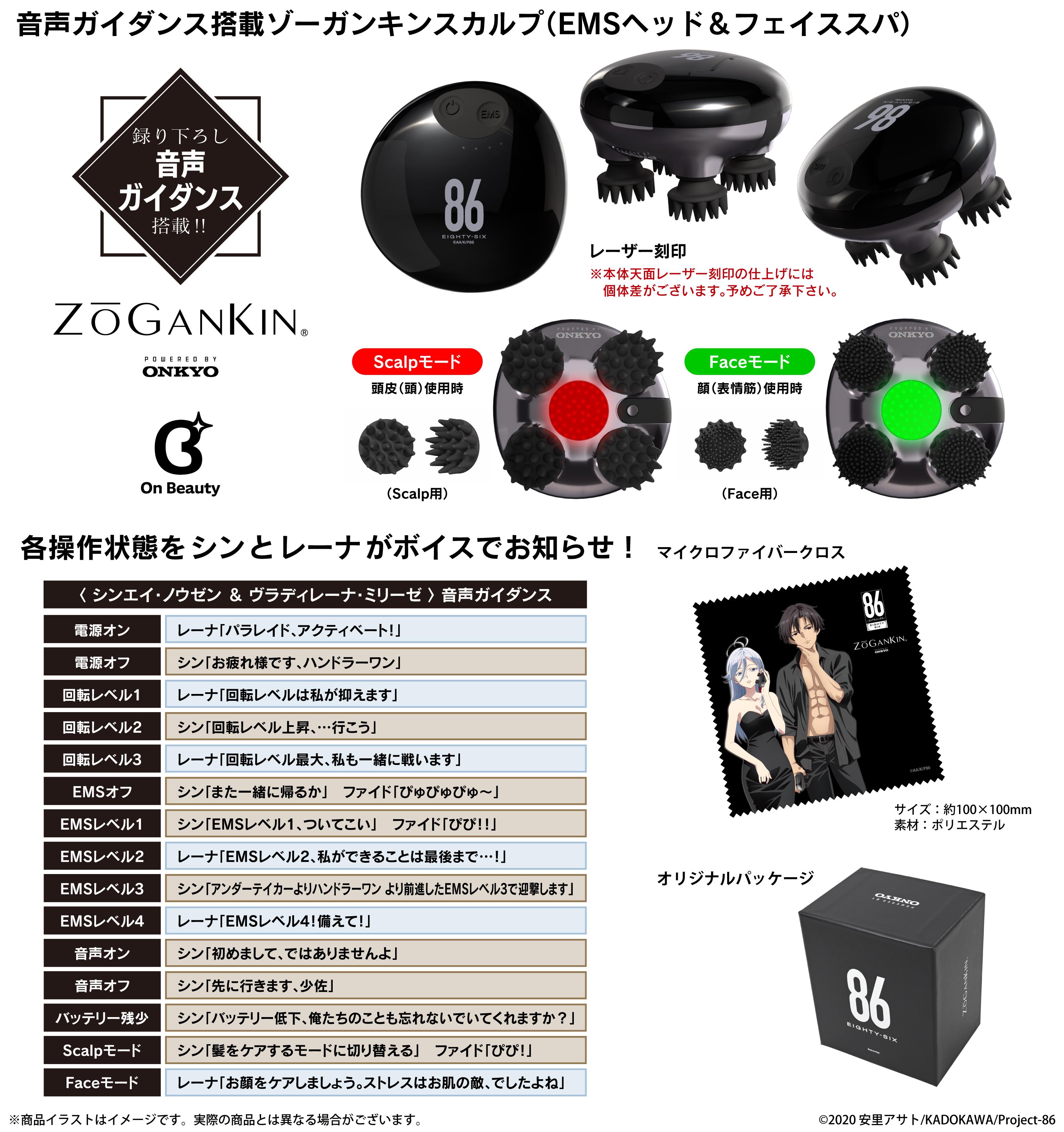 本コラボレーションモデルは、本体天面に作品ロゴを配置し、「シンエイ・ノウゼン」と「ヴラディレーナ・ミリーゼ」による新規録り下ろしボイスを搭載。電源オンやオフ、Scalpモード、Faceモード、回転レベル、EMS等、各操作に応じてガイドしてくれるオリジナルボイス計15ワードを楽しみながら頭皮や表情筋のケアが可能です。尚、描き下ろしイラストマイクロファイバークロスを付属します。
