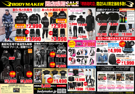 行っているBODYMAKER株式会社(本社:大阪府吹田市垂水町3-16-17 代表:長淵 翔)よりお知らせです。感謝感激!ご愛顧いただきました「イオンモール堺鉄砲町店」は、施設契約満了にともない閉店の運びとなりました。(1月31日(土)完全閉店)ボディメーカーイオンモール堺鉄砲町店では、日頃のご愛顧に対する感謝の気持ちを込めて、1月1日(祝)より「閉店感謝SALE」在庫処分売りつくしをスタートします。