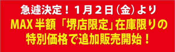 MAX半額「堺店限定」在庫限りの特別価格も急遽追加決定!