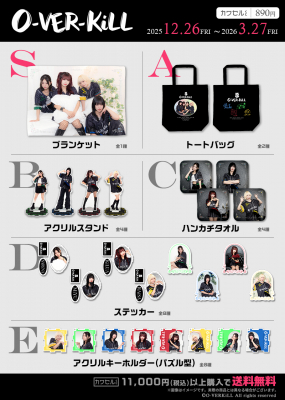 株式会社インクルーズ(東京都渋谷区、代表取締役社長 山﨑 健司)が企画・運営するフィジカルグッズのオンラインくじ「カワセルくじ」にて、12月26日(金)より、「O-VER-KiLL」のくじが販売開始になりましたことをご報告させていただきます。