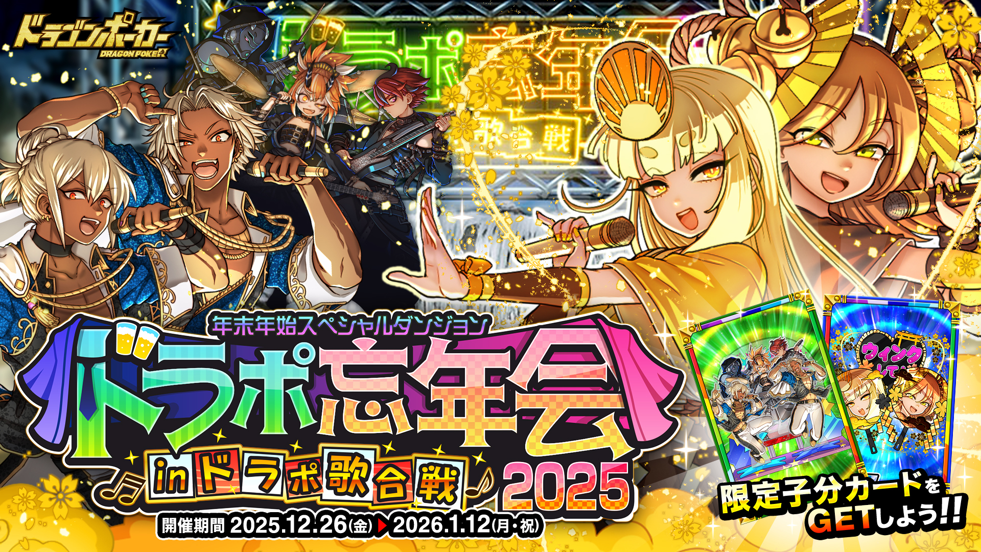 株式会社アソビズム(本社:東京都千代田区、代表取締役:大手智之)は、App Store・Google Playにて好評配信中のリアルタイム合体カードバトル『ドラゴンポーカー』で、2025年12月26日(金)より年末年始スペシャルダンジョン「ドラポ忘年会2025 IN ドラポ歌合戦」を開催いたします。