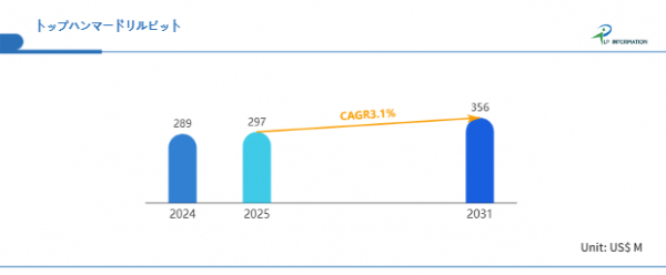 LP Information調査チームの「世界トップハンマードリルビット市場の成長予測2025~2031」(https://www.lpinformation.jp/reports/11359/top-hammer-drill-bits)によれば、2025年から2031年の間にCAGRが3.1%で成長し、2031年までに市場規模は3.56億米ドルに達する見込みである。