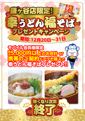 【概要】1回のお会計で税込み合計5,000円以上お買い上げ(スマホの場合はアクセサリとセットでお買い上げ)のお客様に「幸うどん・福そばセット」をプレゼント