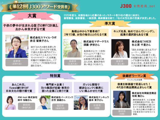 国内最大級の女性経営者データベースサイトを運営する女性社長. net((株)コラボラボ企画・運営 本社:東京都千代田区 代表取締役:横田響子)は、全国の個性あふれる女性起業家・経営者を表彰する「J300アワード」の受賞者7名を、2026年1月29日に発表しました。