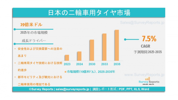 Survey Reports LLCは、2026年1月に「日本の二輪車用タイヤ市場:構造別(ラジアル、バイアス)、用途別(スポーツ、ストリート、マウンテン、クルーザー、その他)―市場分析、動向、機会および予測、2025~2035年」と題する調査レポートを発行したと発表した。本レポートは、日本の二輪車用タイヤ市場に関する予測評価を提供するとともに、成長要因、市場機会、課題、脅威など、複数の主要な市場ダイナミクスを明らかにするものである。