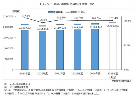 2024年度の国内トイレタリー市場規模(メーカー出荷金額ベース、5分野50品目)は前年度比101.0%の2兆1,704億4,000万円となり、3年連続のプラス成長となった。国内人口が減少基調で推移するなか、トイレタリー商材の数量ベースでの販売拡大が難しく、トイレタリーメーカーは量から質への転換を図ることにより収益性を高める戦略へとシフトしている。