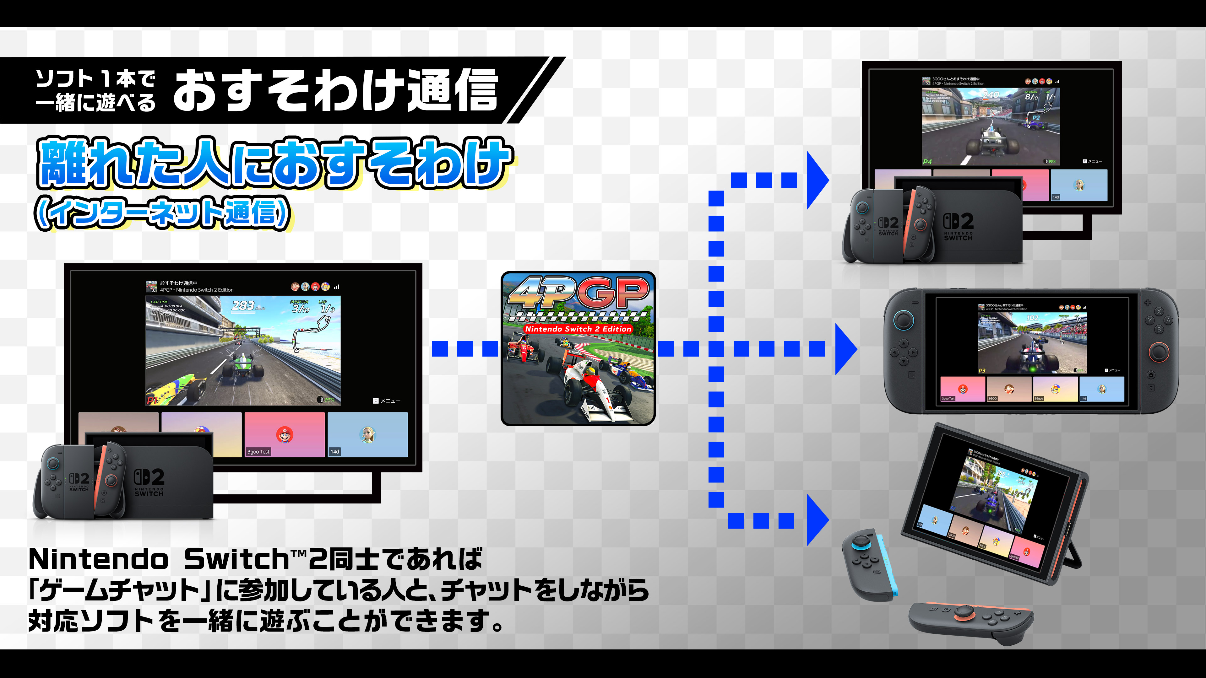 -離れた人におすそわけ(インターネット通信):Nintendo SwitchTM2同士であれば「ゲームチャット」に参加している人と、チャットをしながら一緒にオンラインプレイが出来ます。