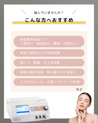 脂肪吸引をはじめとした美容外科手術後の「腫れ・むくみ・つっぱり・違和感」などの軽減を目的に、多くの患者様に術後インディバケアをご利用いただきました。