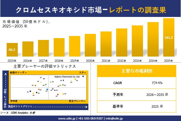 SDKI Analytics(本社:東京都渋谷区)は、このたび、2025年12月31に「クロムセスキオキシド市場調査レポート:2026-2035年の市場規模、シェア、傾向の予測」を発表しました。クロムセスキオキシドに関する市場調査レポートには、統計的および分析的アプローチを使用した予測評価が含まれています。この調査レポートでは、一次および二次調査方法を使用して分析された主要な業界洞察を通じて将来の傾向を理解できるようにすることで、主要な市場動向を読者に説明しています。