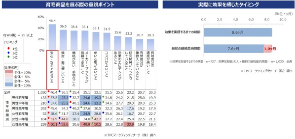 ◆育毛商品を選ぶ際に重視するポイントとして、全体では「安心・安全」が1位となった。なかでも、性年齢層のうち2番目に該当者数が多い『女性高年層』は、「安心・安全であること」「頭皮・髪にやさしいこと」「メーカー・ブランドが信頼できること」などの出現率が全体平均より10pt以上高く、“安心感”が重要なポイントとなっていることがわかる。